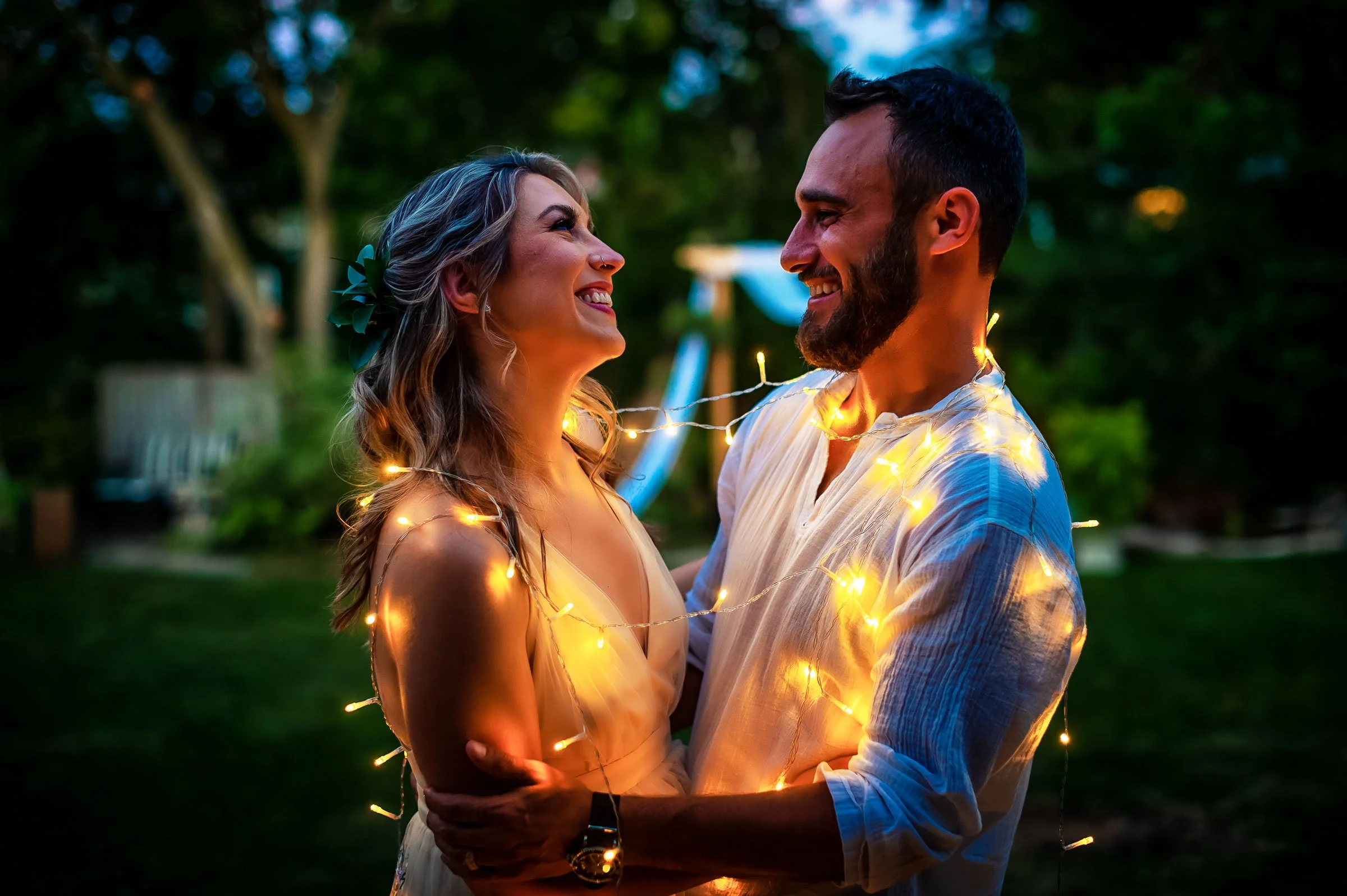 We love creating with the details of your wedding day. These twinkle lights were being pulled down from this backyard elopement and we instantly knew that we had to take advantage of it. The couple kept giggling as we wrapped them in the lights.